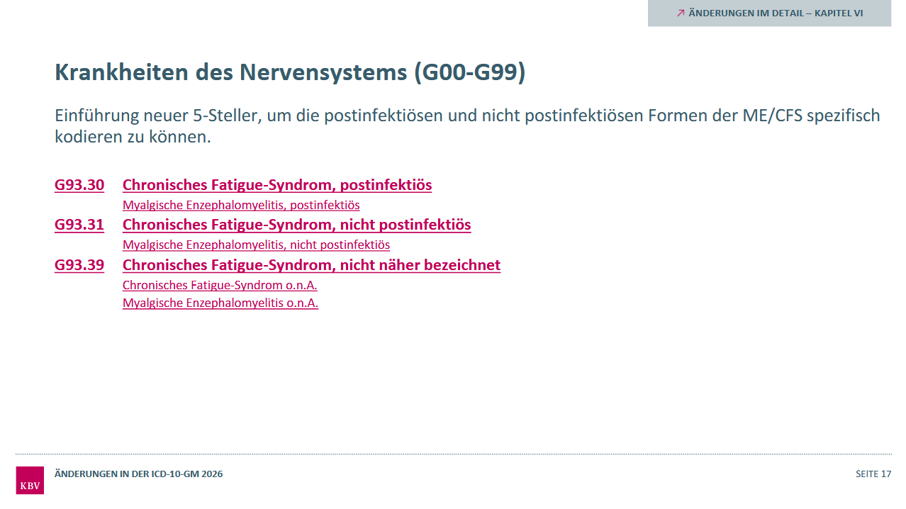 Myalgische Enzephalomyelitis/ Chronisches Fatigue-Syndrom [Chronic fatigue syndrome] (ME/CFS) und Malaise und Fatigue: Einführung neuer 5-Steller, um die postinfektiösen und nicht postinfektiösen Formen der ME/CFS spezifisch kodieren zu können. Diese werden von den Symptomen „Chronische Fatigue mit bzw. ohne Angabe einer post-exertionellen Malaise [PEM]“ durch weitere neue 5-Steller abgegrenzt.