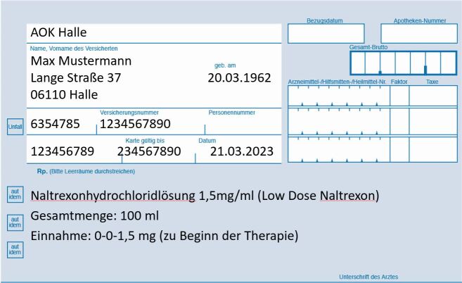 So können Rezepte aussehen. Diese hier sind für die Tropfen. Bei Kapseln sollte drauf stehen: Wirkstoff / Konzentration / Anzahl, also z.B. "Naltrexon(hydrochlorid) 1mg 50 Stckt". Die Angaben zur Einnahme sind meines Wissens optional.