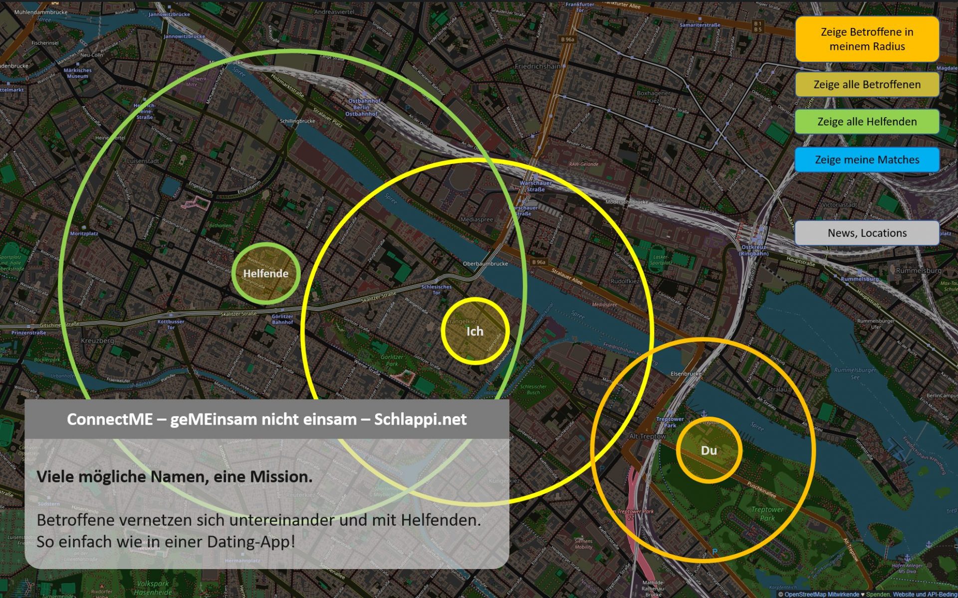Hier setzt ME SupportNet an: Die App ist reizarm gestaltet, einfach zu bedienen und richtet sich konsequent an den Bedürfnissen von ME-Betroffenen aus. Wie bei einer Dating-App sehen Nutzerinnen und Nutzer, wer sich im eigenen Umfeld befindet: andere Betroffene zum Austausch oder Unterstützende, die konkret helfen können – etwa durch Einkäufe, Begleitung zu Arztterminen oder regelmäßige Entlastung im Alltag. Die App erscheint auf Deutsch und Englisch in der Hoffnung, dass sie über Deutschland hinaus Anwendung findet.